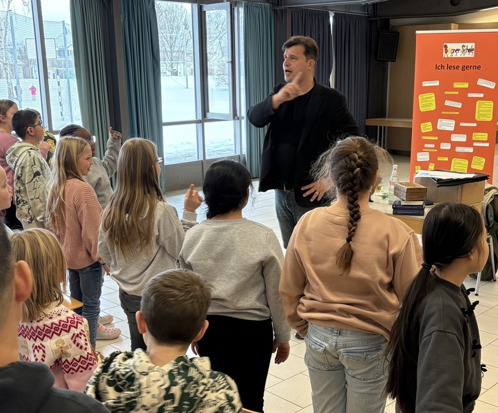 jungen Publikum verstand es Armin Pongs, die Kinder von der ersten Minute an in seinen Bann zu ziehen. Immer wieder wurden die Schülerinnen und Schüler aktiv in die Geschichte einbezogen, durften
