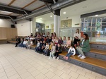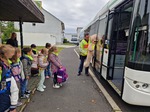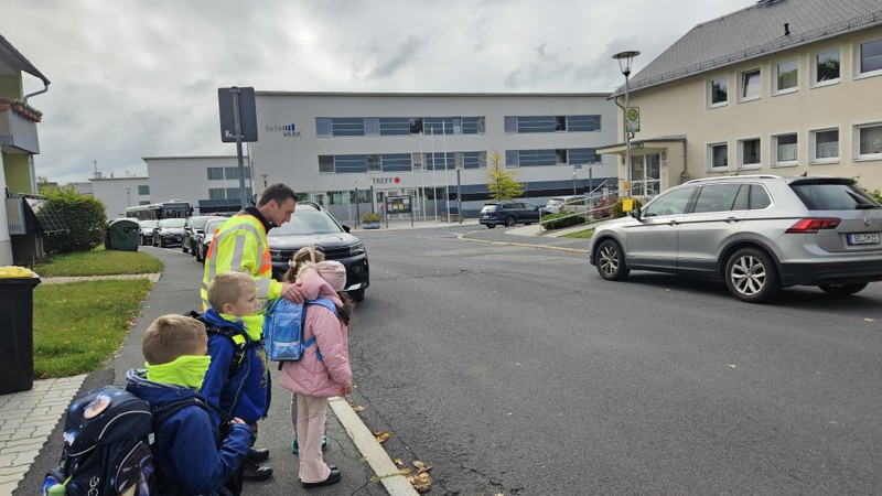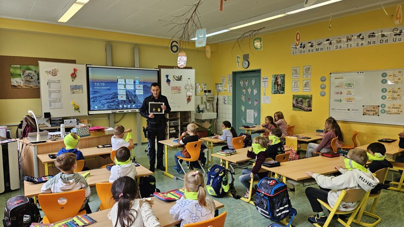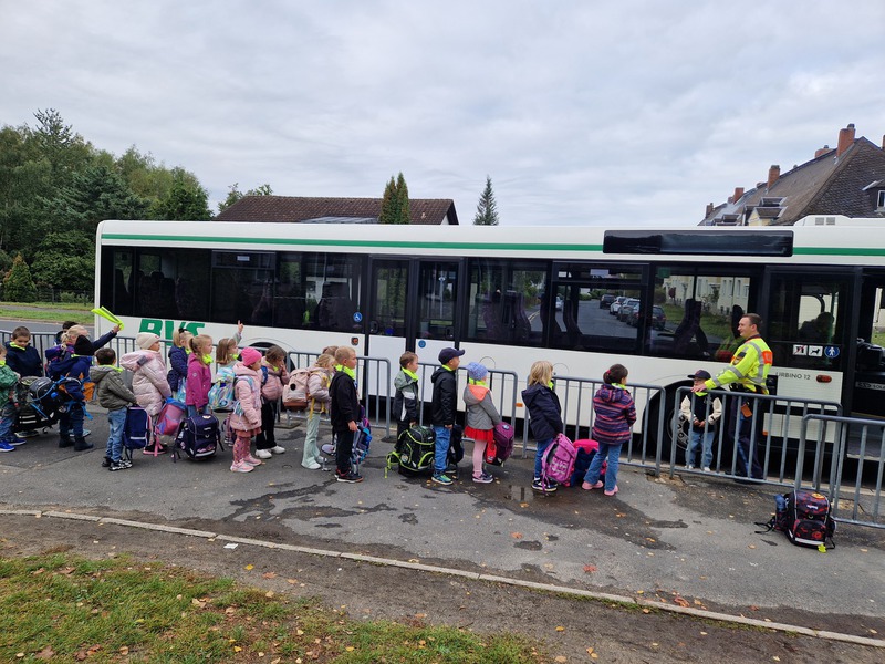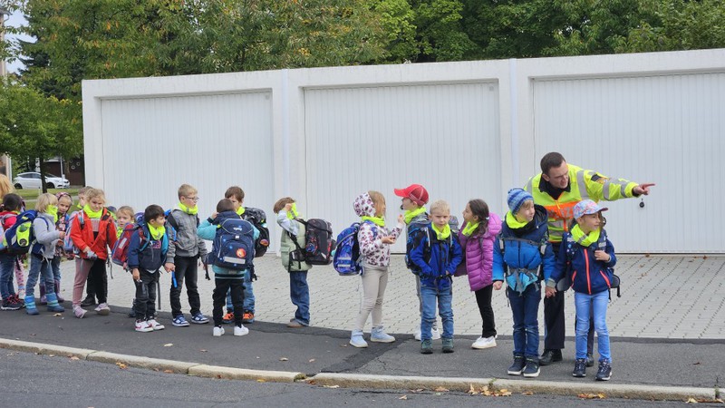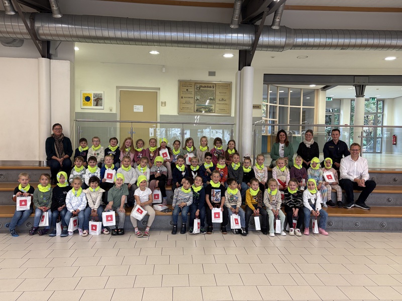 Wie jedes Jahr bekamen die Erstklässler Besuch von der Sparkasse. Diese überreichte den ABC-Schützen neongelbe Halstücher, damit sie im Straßenverkehr besser gesehen werden. Auch unser Verkehrspolizist Herr Melhan übte danach mit den Kindern das richtige Verhalten im Straßenverkehr und beim Bus fahren.